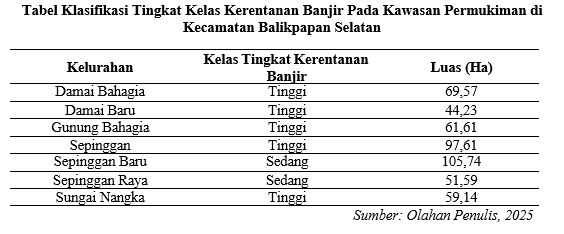 Berdasarkan hasil tabel data klasifikasi tingkat kelas kerentanan bencana banjir pada kawasan permukiman setiap kelurahan di Kecamatan Balikpapan Selatan dapat diketahui bahwa kawasan permukiman dengan tingkat kerentanan yang tinggi berada di Kelurahan Damai Bahagia, Damai Baru, Gunung Bahagia, Sepinggan, dan Sungai Nangka dengan luas tertinggi sebesar 69,57 di Kelurahan Damai Bahagia. Serta, kelurahan dengan tingkat kerentanan sedang berada di Kelurahan Sepinggan Raya dan Sepinggan Baru dengan luas tertinggi sebesar 105,74 Ha di Kelurahan Sepinggan Baru.