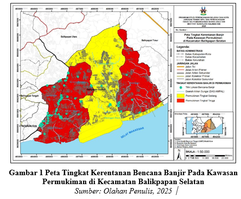 Penelitian ini yang telah dilakukan oleh tim dosen penelitian dan mahasiswa menunjukkan hasil bahwa kawasan permukiman di Kecamatan Balikpapan Selatan memiliki tingkat kerentanan bencana banjir yang didominasi oleh kelas kerentanan tinggi dan sedang, yang dipengaruhi oleh kondisi fisik wilayah seperti ketinggian lahan rendah, kelerengan datar hingga landai, kedekatan dengan aliran sungai DAS Ampal, intensitas curah hujan yang relatif tinggi, serta tingginya tingkat kepadatan permukiman dan perubahan penggunaan lahan. Berdasarkan analisis spasial menggunakan metode overlay dan triangulasi, diketahui bahwa sekitar 55% wilayah permukiman tergolong memiliki kerentanan banjir tinggi, terutama pada Kelurahan Damai Bahagia, Damai Baru, Sepinggan, Gunung Bahagia, dan Sungai Nangka, sedangkan 45% wilayah lainnya berada pada kategori kerentanan sedang, khususnya di Kelurahan Sepinggan Raya dan Sepinggan Baru. Untuk menanggapi kondisi tersebut, penelitian ini merumuskan strategi mitigasi bencana banjir yang terbagi ke dalam upaya struktural dan upaya non struktural, upaya mitigasi banjir secara struktural seperti peningkatan dan normalisasi sistem drainase, pembangunan kolam retensi atau detensi, penataan alur sungai, serta penguatan tanggul, dan upaya mitigasi banjir secara non-struktural berupa pengendalian tata ruang, penguatan sistem peringatan dini, peningkatan kapasitas dan partisipasi masyarakat, serta koordinasi antar pemangku kepentingan, sebagai langkah terpadu dalam mengurangi risiko dan dampak bencana banjir pada kawasan permukiman.