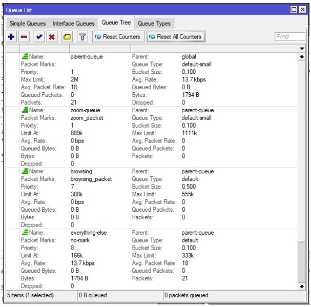 Setelah penandaan paket, metode CBWFQ diterapkan untuk mengatur antrean. Setiap kelas diberikan bobot (weight) dan alokasi bandwidth yang berbeda. Kelas Zoom mendapatkan prioritas tertinggi dengan jaminan bandwidth yang lebih besar untuk meminimalkan latensi, sementara kelas lainnya mendapatkan alokasi sisa secara proporsional. Pendekatan ini memastikan distribusi bandwidth yang adil namun tetap memprioritaskan layanan krusial .