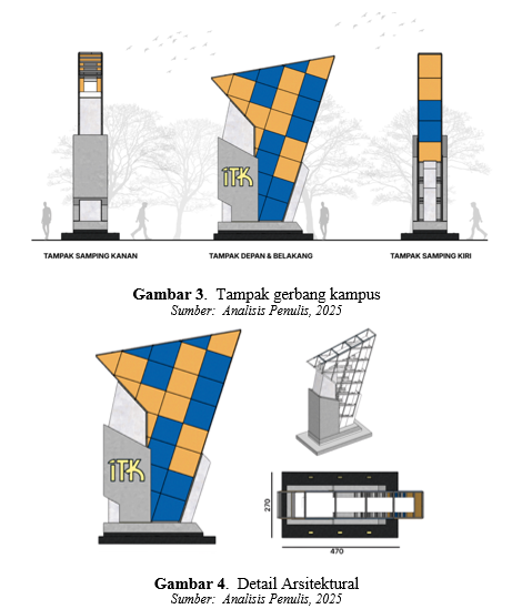 Hasil perancangan gerbang Kampus Institut Teknologi Kalimantan (ITK) dilakukan secara bertahap melalui transformasi desain. Tahapan desain dimulai dari bentuk dasar berupa struktur miring yang terinspirasi dari kemiringan atap bangunan ITK, kemudian berkembang menjadi massa arsitektural yang monumental, hingga penyempurnaan fasad dengan material Aluminium Composite Panel (ACP) berwarna biru dan kuning sebagai identitas kampus.