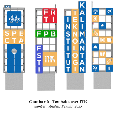 Selanjutnya, tower dirancang sebagai bangunan empat lantai. Lantai dasar berfungsi sebagai ruang kontrol panel kelistrikan dan lanskap kawasan, sementara lantai dua hingga empat digunakan sebagai pemancar cahaya dengan material membran ETFE yang disisipkan lampu LED. Integrasi pencahayaan ini mendukung fungsi penerangan umum sekaligus memperkuat identitas visual kampus pada malam hari. Keempat sisi tower dirancang dengan secondary skin yang menampilkan simbolisme ITK. Sisi selatan tulisan “INSTITUT TEKNOLOGI KALIMANTAN” sebagai identitas utama. Sisi timur simbol empat pusat penelitian ITK, enam elemen budaya Kalimantan (telawang, enggang, batang garing), serta representasi gedung kampus yang sudah ada. Sisi utara slogan “SPECTA” dengan logo ITK terbaru dan motif pin point sebagai spot foto pengunjung. Sisi barat logo ITK dan fakultas yang telah terbentuk FRTI (merah), FPB (hijau), dan FSTI (biru terang).