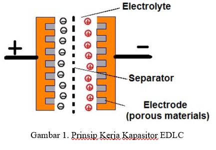 Pada Gambar. 1 tegangan ditentukan oleh jumlah muatan yang disimpan dalam lapisan ganda listrik di sekitar elektroda. Arus saat pengisian atau pengosongan lebih rendah dibandingkan dengan kapasitor konvensional karena proses penyimpanan muatan lebih bergantung pada migrasi ion dalam elektrolit, bukan transfer elektron langsung ke elektroda. Kapasitansi pada EDLC berkaitan dengan kemampuan kapasitor untuk menyimpan muatan pada tegangan tertentu. Nilai kapasitansi EDLC dipengaruhi oleh luas permukaan elektroda dan sifat material elektroda.