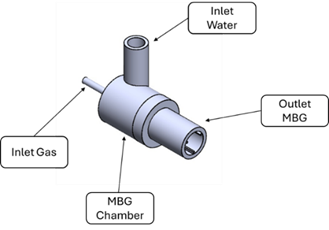 Penelitian ini berfokus pada pengembangan dan karakterisasi microbubble generator tipe aliran swirl (Gambar 1). Pada tipe ini, aliran air dimasukkan secara tangensial ke dalam chamber sehingga membentuk pusaran (swirl) dengan intensitas turbulensi tinggi. Kondisi tersebut menyebabkan tekanan di dalam chamber turun hingga lebih rendah dari tekanan atmosfer, sehingga udara dapat terhisap secara alami dan terpecah menjadi gelembung-gelembung mikro ketika bercampur dengan aliran air. MBG yang digunakan memiliki diameter outlet 30 mm, diameter nosel gas 1,2 mm, dan jarak nosel gas ke outlet sebesar 3 mm. Skema pengujian ditunjukan pada Gambar 2.