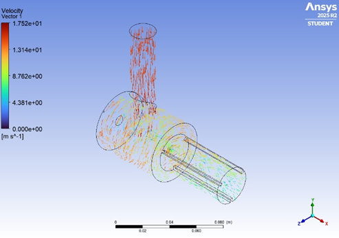 Hasil penelitian menunjukkan bahwa aliran air yang masuk secara tangensial ke dalam chamber menghasilkan pola aliran swirl dengan kecepatan sudut yang tinggi ditunjukan oleh Gambar 3. Pola aliran ini menyebabkan terjadinya gradien tekanan yang signifikan antara dinding chamber dan pusat aliran. Distribusi vektor kecepatan memperlihatkan adanya inti vortex yang terbentuk di sekitar nosel gas.