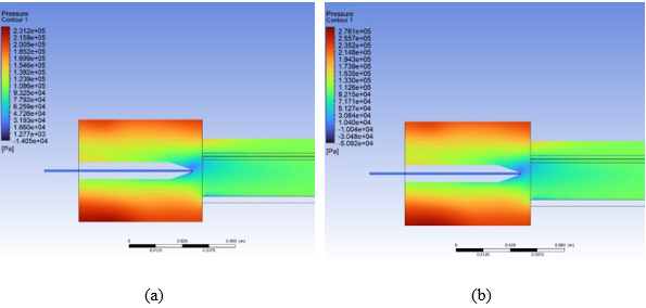 Pada variasi kecepatan inlet air sebesar 11 m/s dan 12 m/s, tekanan minimum yang terjadi di ujung nosel gas masing-masing sebesar 24 kPa dan 5,3 kPa. Nilai tekanan tersebut masih berada di atas tekanan atmosfer sehingga belum mampu menghasilkan mekanisme self-suction udara. Hal ini menunjukkan bahwa intensitas aliran swirl pada kecepatan tersebut masih belum cukup untuk menurunkan tekanan hingga di bawah tekanan atmosfer.