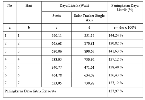 Setelah berhasil, alat mengambil 7 data harian untuk dibandingkan dengan data sebelumnya yaitu pada alat Mobile Photovoltaic Station statis, sehingga efektivitas Mobile Photovoltaic Station Dengan Single Axis Solar Tracking dengan dapat dinilai. Berikut data yang didapatkan dari hasil lapangan: