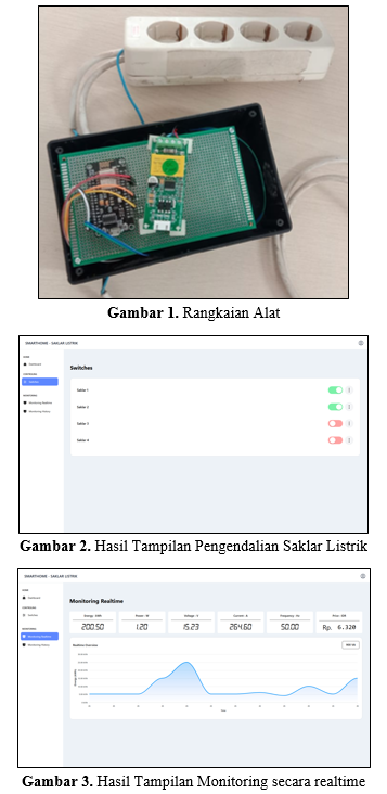 Dengan demikian, pada versi ini tidak hanya dapat berfungsi untuk alat bantu secara teknis, namun dapat juga sebgai inovasi efisiesi dan manajemen energi listrik, baik pada rumah tangga maupun pada industri. Adapun hasil dari rangkaian alat yang dikembangkan dapat dilihat pada gambar 1. Selain itu, hasil dari sitem monitoring dan pengendalian energi listrik dapat dilihat pada gambar 2, gambar 3, dan gambar 4.