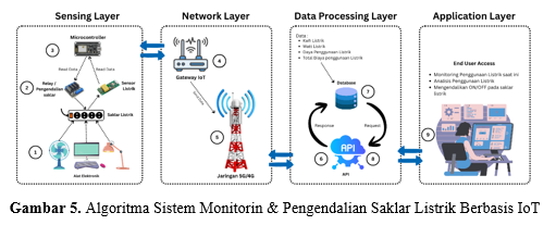 Berdasarkan gambar diatas yang merupakan arsitektur atau algoritma dari sistem monitoring & pengendalian listrik berbasis IoT, bahwa setiap layer memiliki tahapan seperti berikut.