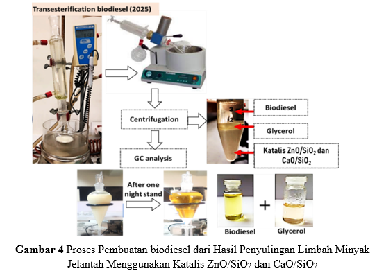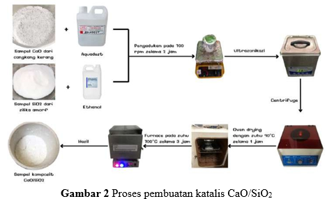 Serbuk CaO dilarutkan dalam aquadest 100 ml dan serbuk SiO2 dilarutkan dalam etanol 100 ml, lalu diaduk dengan kecepatan 700 rpm selama 2 jam. Padatannya dipisahkan menggunakan centrifuge, lalu dicuci menggunakan air. Langkah selanjutnya adalah mengeringkan padatan tersebut menggunakan oven pada suhu 90°C selama 1 jam. Setelah itu, hasilnya dikalsinasi di furnace pada suhu 700°C selama 3 jam. Selanjutnya, serbuk kering CaO/SiO2 kemudian dihaluskan dan selanjutnya dikalsinasi pada suhu yang berbeda yakni 500 sampai 900°C. Prosedur yang sama dilakukan untuk katalis ZnO/SiO2. Larutan campuran ZnO dan SiO2 diaduk, kemudian difiltrasi dengan menggunakan pompa vakum dan dilakukan pengeringan pada filtrat menggunakan oven drying selama 6 jam. Setelah selesai dioven padatan dikalsinasi pada suhu 800⁰C selama 5 jam. Dilakukan proses pengadukan dan filtrasi untuk mendapatkan filtrat sodium silikat (NaSiO3). Hasil filtrat ditambahkan indikator pp selanjutnya dilakukan proses titrasi menggunakan larutan HCl 10% disimpan dalam desikator dan proses pengeringan menggunakan oven drying. Produk material selanjutnya dikalsinasi dengan suhu (T=900°C) selama 3 jam untuk mendapatkan serbuk ZnO/SiO2. Masing-masing katalis ZnO/SiO2 dan CaO/SiO2 diujicobakan pada reaksi transesterifikasi biodiesel dari hasil penyulingan limbah minyak jelantah.