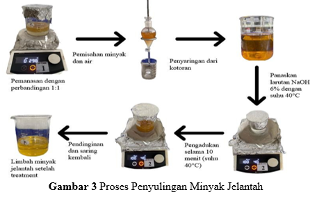 Proses pemurnian minyak jelantah terdiri dari dua tahap utama, yaitu despicing dan netralisasi, sebagaimana diuraikan dalam penelitian yang dilakukan oleh Busyairi et al. (2020). Tujuan dari tahap-tahap ini adalah untuk menurunkan konsentrasi asam lemak bebas (FFA) dan menghilangkan kontaminan dalam minyak jelantah. Awalnya, minyak jelantah mengalami proses penyaringan untuk memisahkan minyak dari kontaminan atau partikel apa pun. Selain itu, proses ini melibatkan pemanasan minyak jelantah hingga suhu 120°C selama 10 menit untuk menghilangkan air yang ada. Hal ini diperlukan karena kadar air yang tinggi dapat menyebabkan reaksi saponifikasi, yang menghambat produksi metil ester. Proses pemurnian minyak jelantah melibatkan pemisahan kontaminan dan pengurangan kadar Asam Lemak Bebas (FFA) dengan menetralkannya dengan larutan Natrium Hidroksida (NaOH) 6%. Minyak jelantah dan air dipanaskan dengan perbandingan 1:1 hingga volume air berkurang setengahnya. Selain itu, kontaminan padat yang mengendap dipisahkan dengan kertas saring, dan minyak selanjutnya dipindahkan ke corong pemisah untuk memisahkannya dari air. Selanjutnya, minyak dipanaskan kembali hingga suhu tepat 40°C. Kemudian, larutan yang mengandung 6% NaOH ditambahkan ke minyak dengan perbandingan 2 mL per 50 mL minyak. Campuran minyak jelantah dan NaOH dicampur secara menyeluruh selama 10 menit pada suhu 40°C. Selanjutnya, didinginkan dan dilakukan penyaringan untuk memisahkan minyak jelantah dari pengotor.