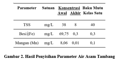 Kesimpulannya, karbon aktif kayu sengon tanpa aktivasi memang dapat meningkatkan pH dan menurunkan TSS, tetapi belum efektif mengurangi konsentrasi Fe dan Mn. Penelitian lebih lanjut perlu diarahkan pada optimasi kondisi aktivasi (suhu, waktu, konsentrasi bahan kimia), modifikasi permukaan karbon, atau kombinasi dengan metode lain seperti membran atau koagulasi, agar dapat meningkatkan kinerja penyisihan logam berat.