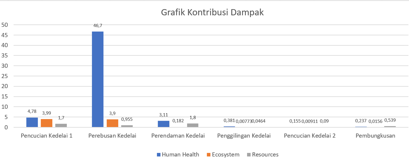 Melalui analisis LCA menggunakan perangkat lunak SimaPro, diketahui bahwa perebusan kedelai memberikan kontribusi dampak terbesar pada tiga kategori penilaian, yaitu human health, ecosystem, dan resources. Penggunaan kayu bakar sebagai sumber energi menjadi penyebab utama tingginya emisi CO₂, CH₄, dan N₂O. Berdasarkan perhitungan, pembakaran 35 kilogram kayu per hari menghasilkan 61,15 kg CO₂, 16,38 kg CH₄, dan 2,18 kg N₂O—angka yang jauh lebih besar dibandingkan proses lainnya.
