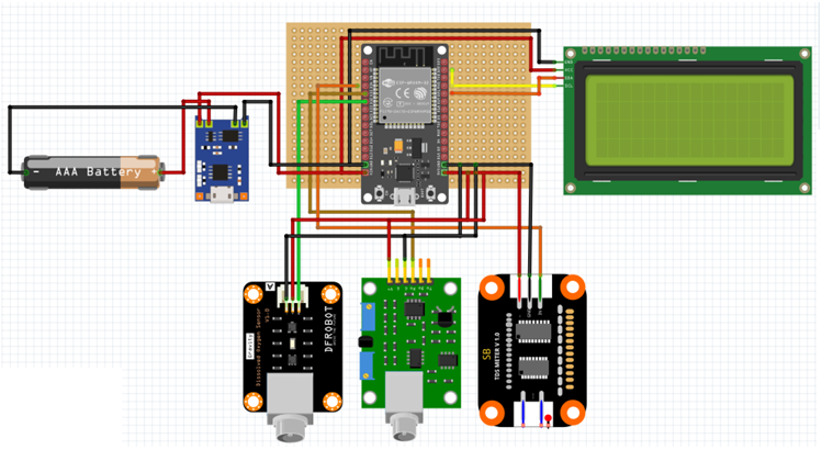 - Dapat dilihat juga modul LCD 20x4 I2C yang terpasang, serta modul pengisi daya TP4056 dan baterai Li-ion untuk sistem portabel.