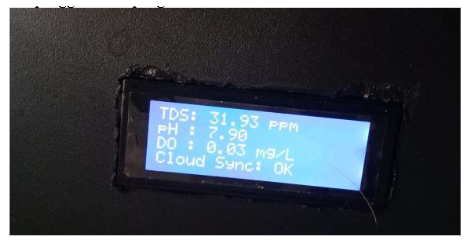 - Pada layar LCD, terlihat tiga baris data yang jelas: pH: [nilai], TDS: [nilai] ppm, dan DO: [nilai] mg/L.