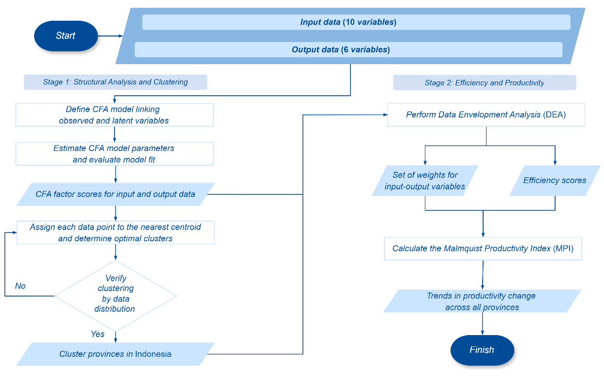 Kebutuhan untuk memahami faktor-faktor yang memengaruhi kinerja serta efisiensi unit yang menjadi objek kajian merupakan alasan utama dalam membangun sistem evaluasi kinerja. Pendekatan yang dipilih adalah dengan mengombinasikan beberapa metode analisis, yakni analisis deskriptif, analisis faktor konfirmatori (confirmatory factor analysis, CFA), analisis klaster, dan analisis pembungkus data (data envelopment analysis, DEA). Kombinasi ini dipilih untuk memberikan hasil yang komprehensif, baik dari segi validitas instrumen, segmentasi responden, hingga pengukuran efisiensi relatif antarunit.
