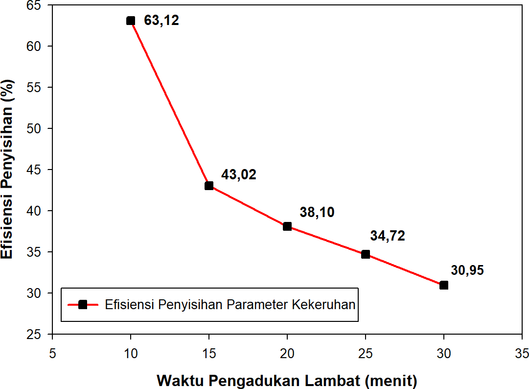 Pada parameter Kekeruhan waktu pengadukan lambat 10 hingga 30 menit, efisiensi penyisihan parameter Kekeruhan mengalami penurunan dari 63,12% menjadi 30,95%. Parameter Kekeruhan dengan efisiensi penyisihan optimum berada pada waktu 10 menit dengan presentase sebesar 63,21%. Hal ini sejalan dengan penelitian (Rohana et al., 2023) pada waktu pengadukan lambat 10 menit menghasilkan efisiensi penyisihan parameter Kekeruhan sebesar 99,83%, jika pengadukan dilakukan terlalu lama maka flokulasi tidak efektif. Waktu yang terlalu lama dapat mengakibatkan flok yang sudah terbentuk menjadi pecah (Cundari et al., 2022).