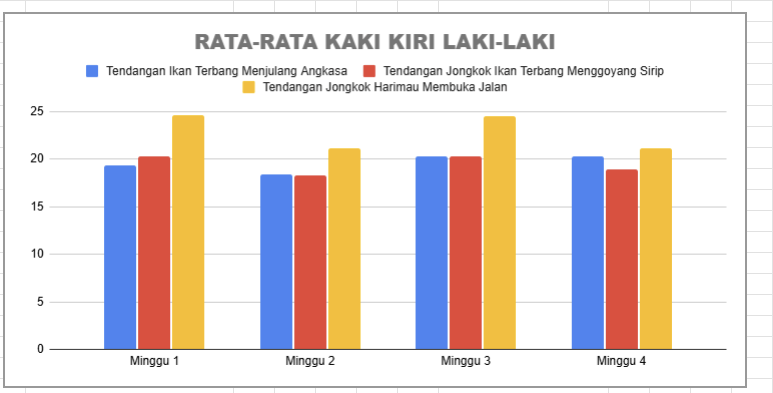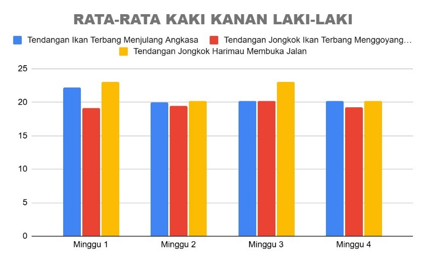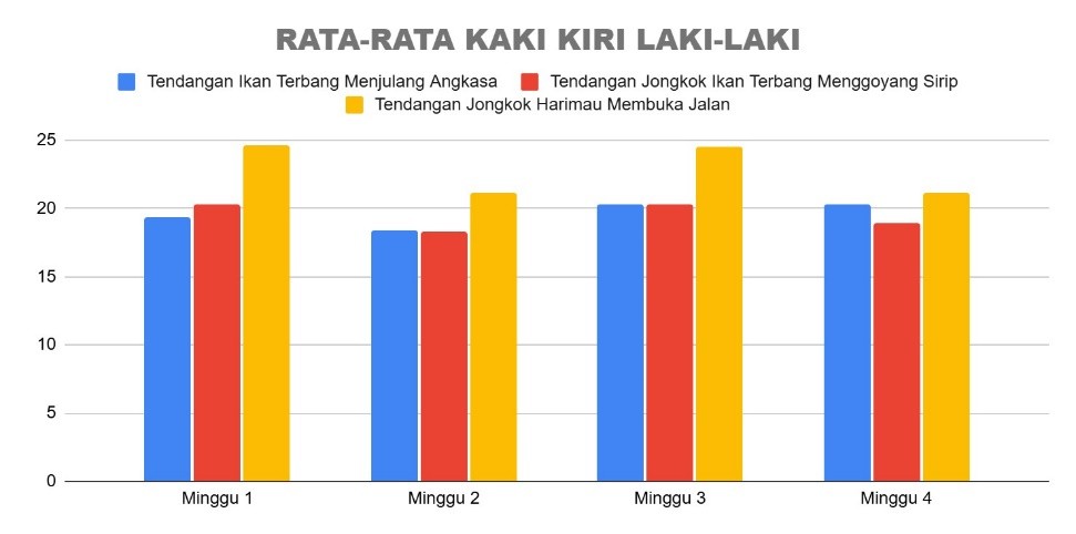 Sementara itu, pada santri laki-laki, performa tendangan kaki kiri didominasi oleh jenis Jongkok Harimau Membuka Jalan yang mencatat skor tertinggi secara konsisten setiap minggu, terutama pada minggu pertama dan ketiga. Dua jenis tendangan lainnya, yaitu Ikan Terbang Menjulang Angkasa dan Jongkok Ikan Terbang Menggoyang Sirip, terlihat jauh di bawah tendangan Harimau, dan hanya mengalami sedikit fluktuasi. Pola yang sama juga terlihat pada kaki kanan santri laki-laki, di mana tendangan Harimau Membuka Jalan tetap menunjukkan performa terbaik dan stabil. Sementara dua jenis tendangan lainnya memiliki skor yang cukup seimbang dan hanya mengalami sedikit peningkatan, terutama pada minggu ketiga. Menariknya, pada minggu keempat, performa tendangan Ikan Terbang Menjulang Angkasa mulai mendekati skor tendangan Harimau.