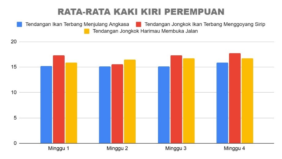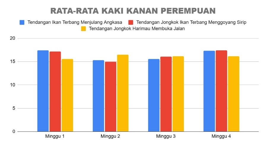 Pada santri perempuan, kekuatan tendangan kaki kiri menunjukkan bahwa jenis tendangan Jongkok Ikan Terbang Menggoyang Sirip secara konsisten memiliki performa paling tinggi dari minggu ke minggu. Diikuti oleh tendangan Jongkok Harimau Membuka Jalan yang juga menunjukkan tren peningkatan secara perlahan. Sementara itu, tendangan Ikan Terbang Menjulang Angkasa cenderung stabil dan berada di posisi paling rendah. Secara keseluruhan, ketiga jenis tendangan pada kaki kiri santri perempuan menunjukkan tren positif, dengan peningkatan performa seiring waktu latihan. Untuk kaki kanan santri perempuan, pola performa cenderung lebih bervariasi. Tendangan Ikan Terbang Menjulang Angkasa menjadi yang paling dominan di minggu pertama dan minggu keempat. Namun pada minggu kedua, tendangan Harimau Membuka Jalan justru mencatatkan skor tertinggi, meskipun kemudian menurun secara perlahan. Tendangan Jongkok Ikan Terbang juga menunjukkan peningkatan dari minggu ke minggu, namun tidak setinggi dua jenis tendangan lainnya. Secara umum, performa tendangan kaki kanan pada santri perempuan bersifat merata, dengan perbedaan nilai antar tendangan yang tidak terlalu mencolok.