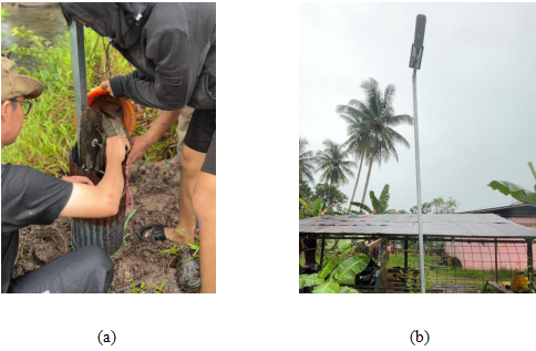 Gambar3. (a)Proses Pembuatan Pondasi Lampu dan (b) Hasil Pemasangan Lampu