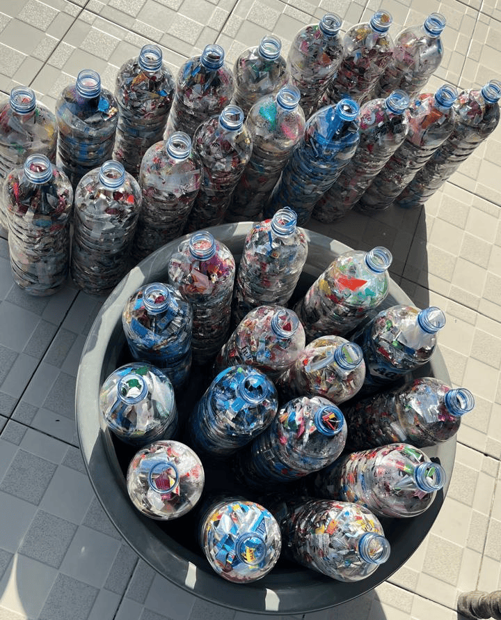 Pembuatan Ecobrick dilakukan dengan memanfaatkan sampah plastik bekas seperti kantong kresek, kemasan makanan ringan, plastik mika, dan jenis plastik non-organik lainnya yang sulit terurai. Sampah plastik dikumpulkan dari rumah tangga dan lingkungan sekitar RT. 06, kemudian dicuci dan dikeringkan untuk memastikan tidak ada sisa organik yang dapat membusuk. Setelah bersih dan kering, plastik-plastik tersebut dipotong kecil dan dipadatkan ke dalam botol plastik bekas berukuran 1,5 liter menggunakan tongkat kayu. Pemadatan dilakukan secara merata hingga botol padat, sehingga ecobrick kuat dan stabil untuk digunakan sebagai bahan pengisi gapura.