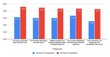 Nilai kenaikan persepsi kualitas air dan kesehatan masyarakat setelah pengabdian mengalami peningkatan diataranya, kejernihan air meningkat sebesar (+1.49), air yang tidak berbau dan tidak berasa meningkat (+1.47), jarang mengalami masalah kesehatan akibat air meningkat (+1.33), kemudahan mendapatkan air bersih untuk kebutuhan sehari-hari meningkat (+1.00), dan pemahaman cara penggunaan serta pemeliharaan filter air bor meningkat paling tinggi sebesar (+1.71). Peningkatan ini menunjukkan dampak positif yang signifikan dari program pengabdian terhadap kualitas hidup masyarakat melalui peningkatan kualitas air dan kapasitas pengelolaan teknologi filter air.