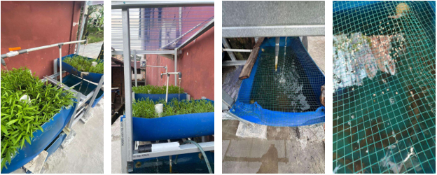 Rangkaian akuaponik adalah sistem terpadu yang menggabungkan budidaya ikan (akuakultur) dan penanaman tanaman tanpa tanah (hidroponik) dalam satu ekosistem yang saling mendukung. Rangkaian sistem akuaponik ini dimulai dengan menyiapkan kolam budidaya menggunakan drum yang diletakkan di atas rangka baja sebagai penopang. Drum kemudian diisi air untuk memastikan tidak bocor dan layak digunakan sebagai kolam ikan. Setelah itu, dibangun rangka akuaponik untuk menampung media tanam yang terhubung dengan kolam ikan, membentuk sistem sirkulasi air yang saling menguntungkan antara ikan dan tanaman yang dibantu dengan pompa air. Selama proses budidaya, ikan diberi pakan satu kali sehari secukupnya, sedangkan pada tanaman kangkung tidak memerlukan pupuk tambahan karena nutrisi diperoleh dari kotoran dan sisa pakan ikan yang terurai dalam air.