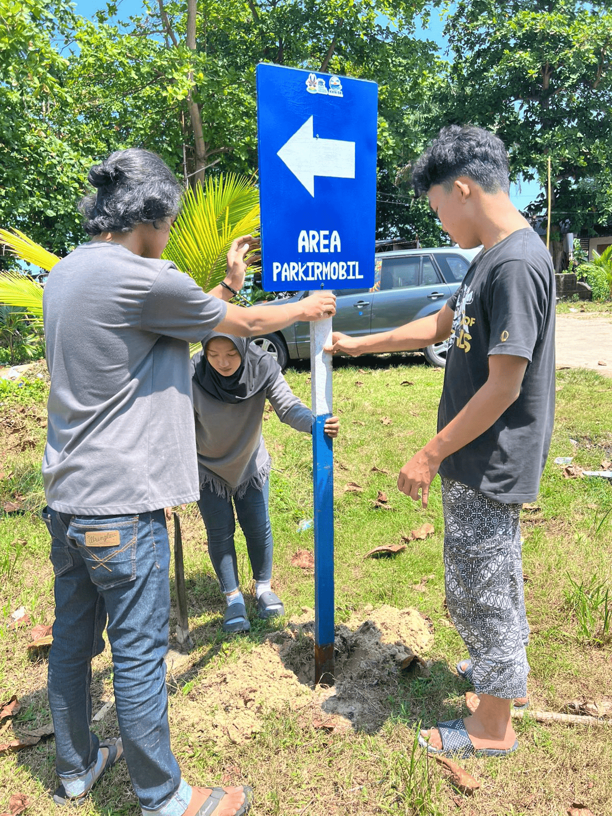 Selain itu, tim KKN R5 ITK juga membangun papan petunjuk parkiran untuk mengatur area kendaraan pengunjung agar tidak mengganggu akses nelayan maupun merusak area pantai. Papan petunjuk ini dirancang agar mudah dipahami oleh wisatawan, serta menyesuaikan dengan estetika lingkungan sekitar.