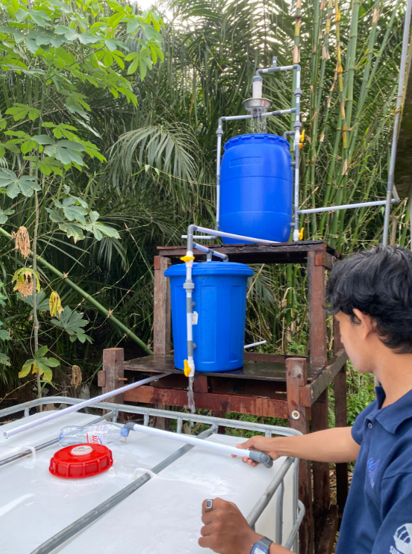 Mahasiswa melakukan survei, pengambilan sampel air, dan pengujian kualitas air dari sumur warga sebelum merancang sistem penyaringan menggunakan biofilter vertikal yang terdiri dari pasir malang, manganese green sand, karbon aktif, dan pasir silika. Sistem ini dibangun dengan struktur dudukan dari kayu ulin yang dirancang agar aliran air berjalan secara gravitasi. Selain itu, mahasiswa juga mengadakan sosialisasi kepada warga mengenai pentingnya air bersih, cara penggunaan dan perawatan alat penyaring, serta edukasi tentang tanaman penyaring alami seperti eceng gondok dan akar wangi.