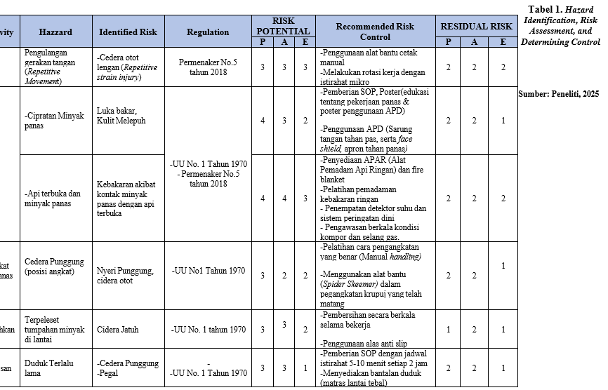UMKM juga memiliki potensi bahaya yang tinggi, terutama dalam sektor makanan. Keterbatasan sumber daya manusia dan finansial membuat UMKM rentan terhadap kecelakaan dan penyakit akibat kerja (ILO, 2018). Salah satu aspek penting dalam operasional UMKM adalah memastikan tidak munculnya bahaya maupun risiko selama proses kerja berlangsung. Namun kenyataannya, UMKM justru termasuk sektor yang paling rawan mengalami kecelakaan atau penyakit akibat kerja, terutama karena belum menerapkan sistem manajemen K3 yang terstruktur. Upaya pengendalian pun biasanya hanya sebatas pada penggunaan Alat Pelindung Diri (APD), tanpa disertai pengendalian administratif maupun rekayasa teknis. Bahaya yang sering ditemukan antara lain berasal dari aktivitas kerja yang tidak ergonomis dan lingkungan kerja yang tidak aman (Yusmawati, Liku, & Yuliana, 2024).