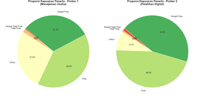 Dari sisi evaluasi, kegiatan dinilai cukup berhasil menjawab kebutuhan awal mitra. Peserta yang sebelumnya belum familiar dengan aplikasi desain dan editing video kini mampu membuat logo dan konten promosi secara mandiri. Antusiasme warga terlihat dari banyaknya pertanyaan yang diajukan, keaktifan saat praktik, serta munculnya ketertarikan lanjutan terhadap pemanfaatan teknologi, termasuk keinginan untuk mempelajari penggunaan Artificial Intelligence (AI) dalam produksi konten. Hasil kuesioner kepuasan juga menunjukkan bahwa mayoritas peserta, sekitar 70 persen pada Program Pengelolaan Sumber Daya Manusia dan Strategi Pemasaran dan hampir 90 persen pada Program Pelatihan Desain Grafis dan Produksi Video Promosi, menyatakan puas hingga sangat puas, yang menegaskan bahwa masyarakat merasa sangat terbantu dengan adanya kegiatan inovasi sosial ini.
